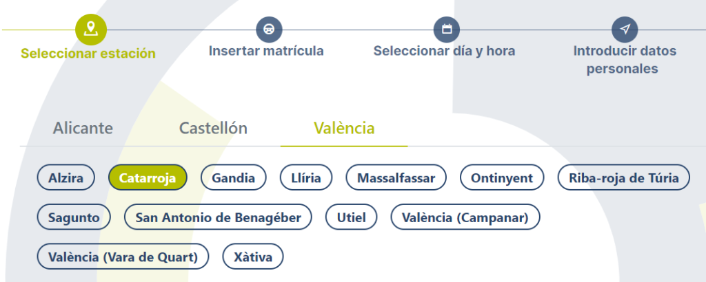 El primer paso es seleccionar la estación de ITV en la web de SITVAL. Para ello, elige la provincia de Valencia y después la estación de Catarroja.