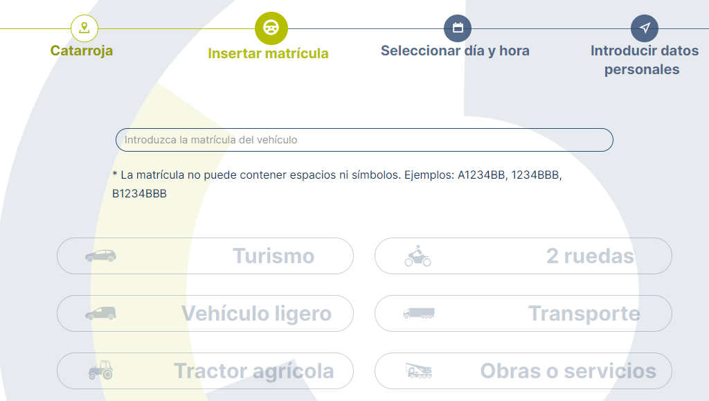 Indica tu matrícula. Además, elige el tipo de vehículo.