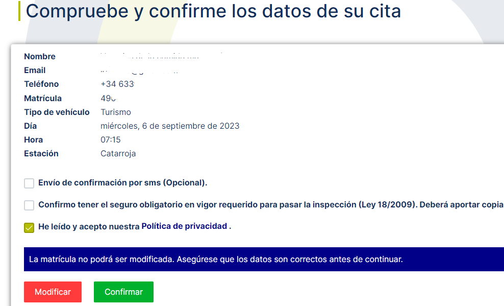 Comprueba que toda la información sea correcta y pulsa el botón verde de “Confirmar”. Una vez completado este paso, la cita quedará reservada. El pago se realizará directamente en la estación de ITV. No olvides acudir con algo de antelación.